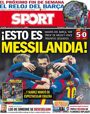 نشرت صحيفتي السبورت والموندو غلافيهما ليوم الإثنين 16/02/2015 عبر الموقع الالكتروني الخاص بكلا الصحيفتين، وكانت أبرز العناوين تدور حول فوز البارسا أمس على ليفانتي بخماسية وتألق الترايدنت مرة أخرى.